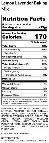 Ingredients: Allulose, Monk Fruit Extract, Almonds, Butter (Cream), Nonfat Milk, Milk, Cassava, Sweet Cream Buttermilk Solids, Grass Fed Whey Protein Powder, Micellar Casein, Lemon, Salt, Sodium Acid Pyrophosphate, Sodium Bicarbonate, Cornstarch, Monocalcium Phosphate.
